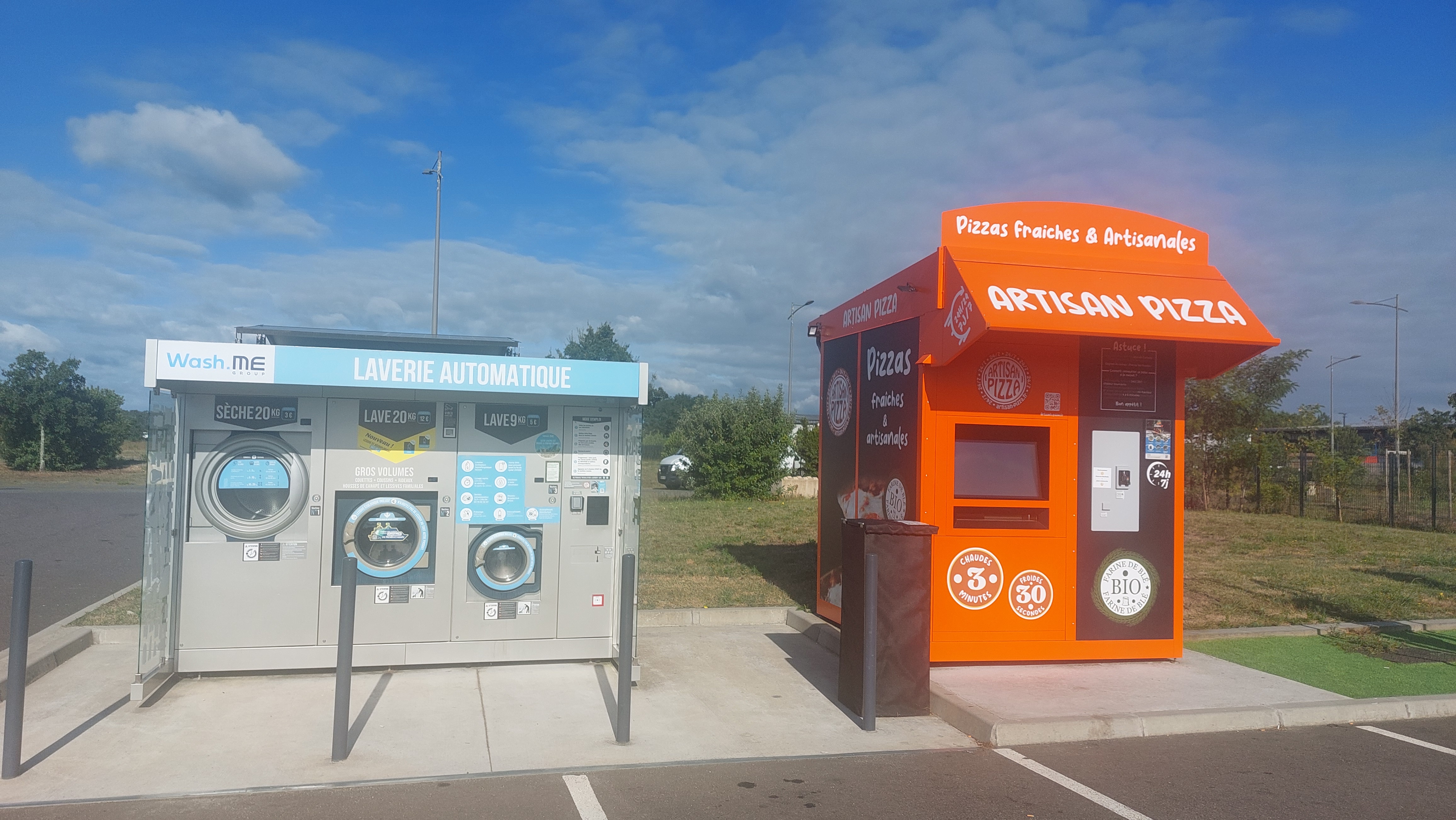 Automatická pračka a automat na pizzu u zastrčené benzínové pumpy.
