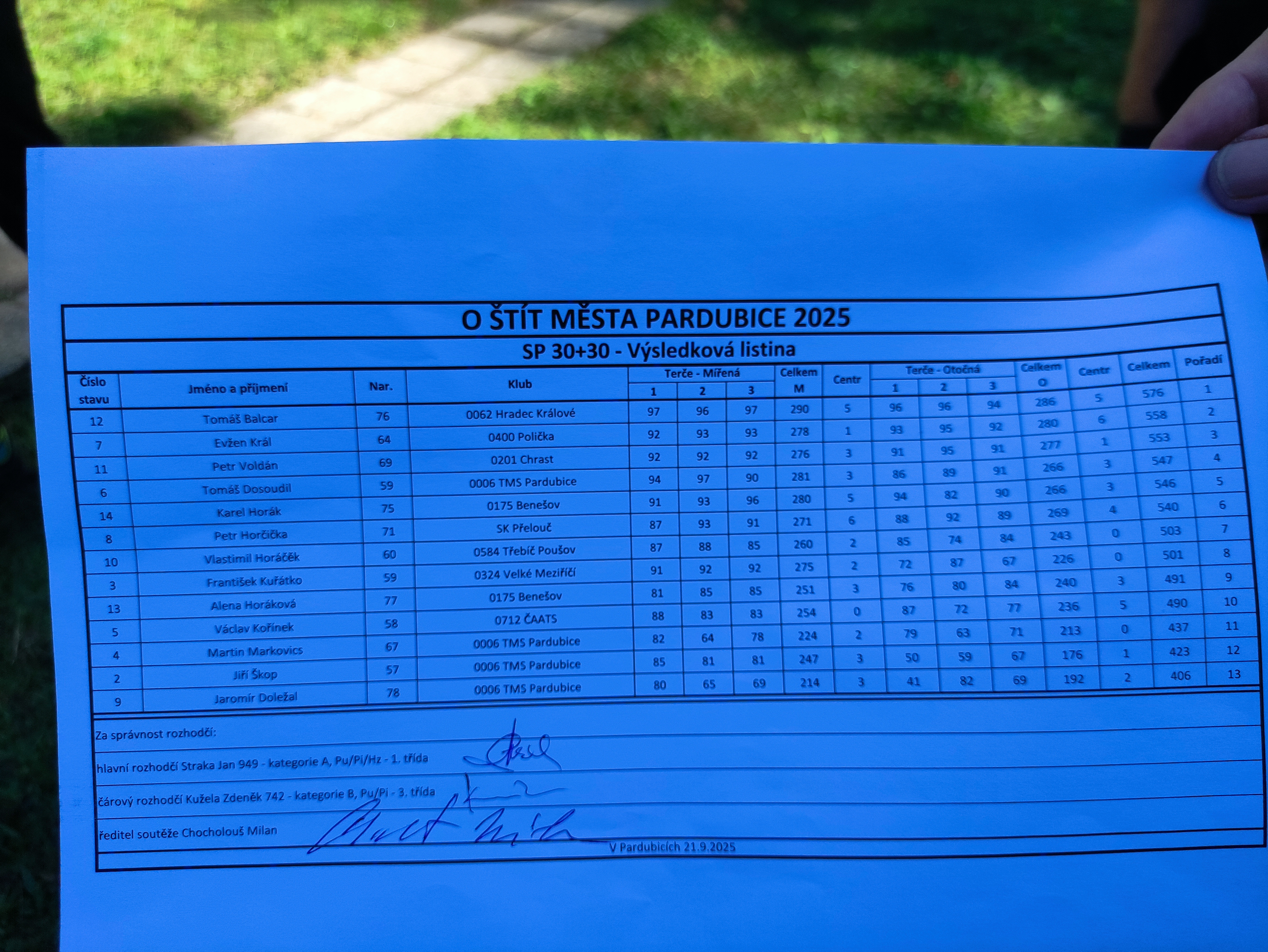 O štít města Pardubice se bojovalo na Pardubické střelnici v disciplíně Sportovní pistole dne 21.9.2025 za komorní účasti 13 střelců.