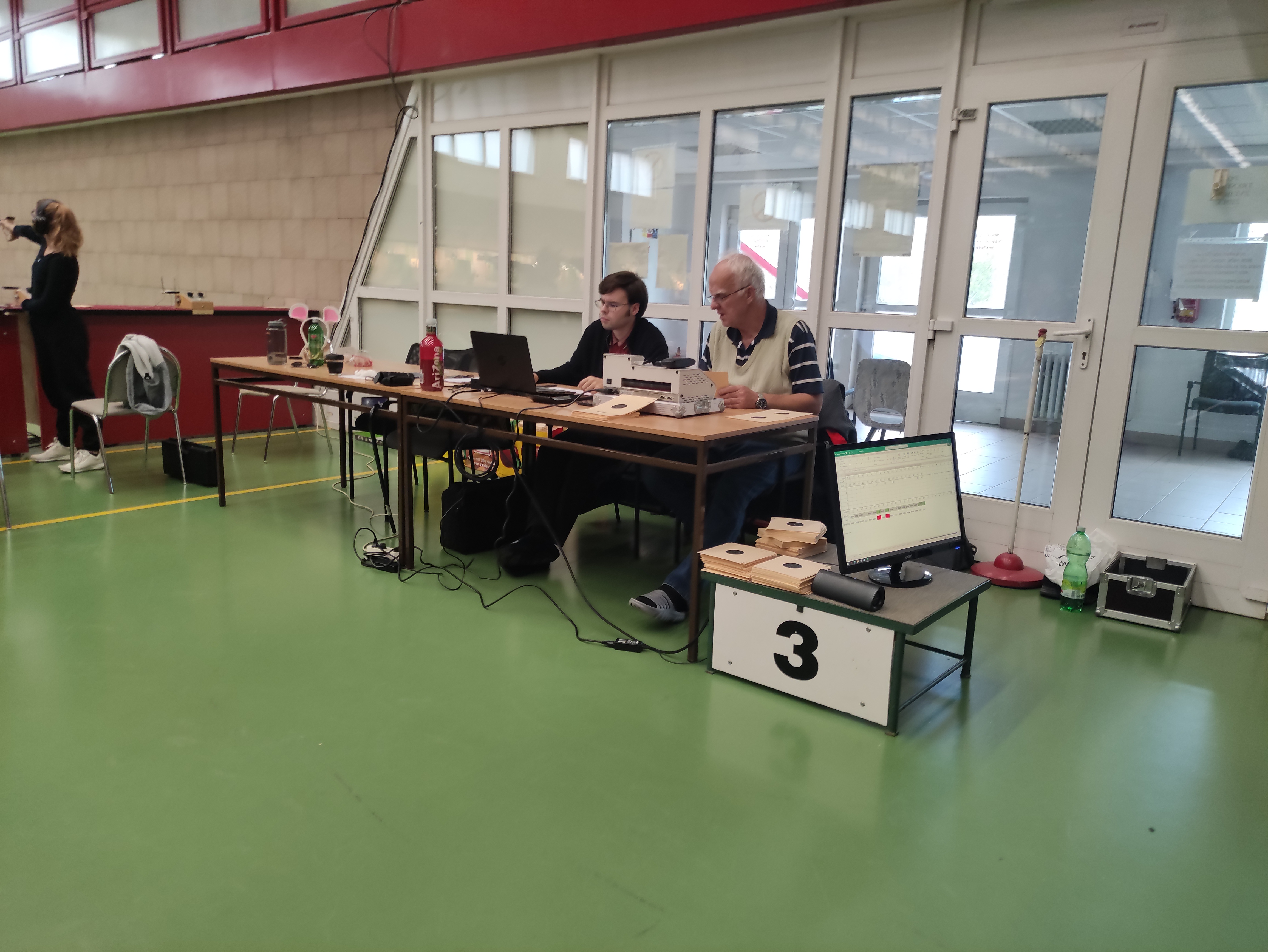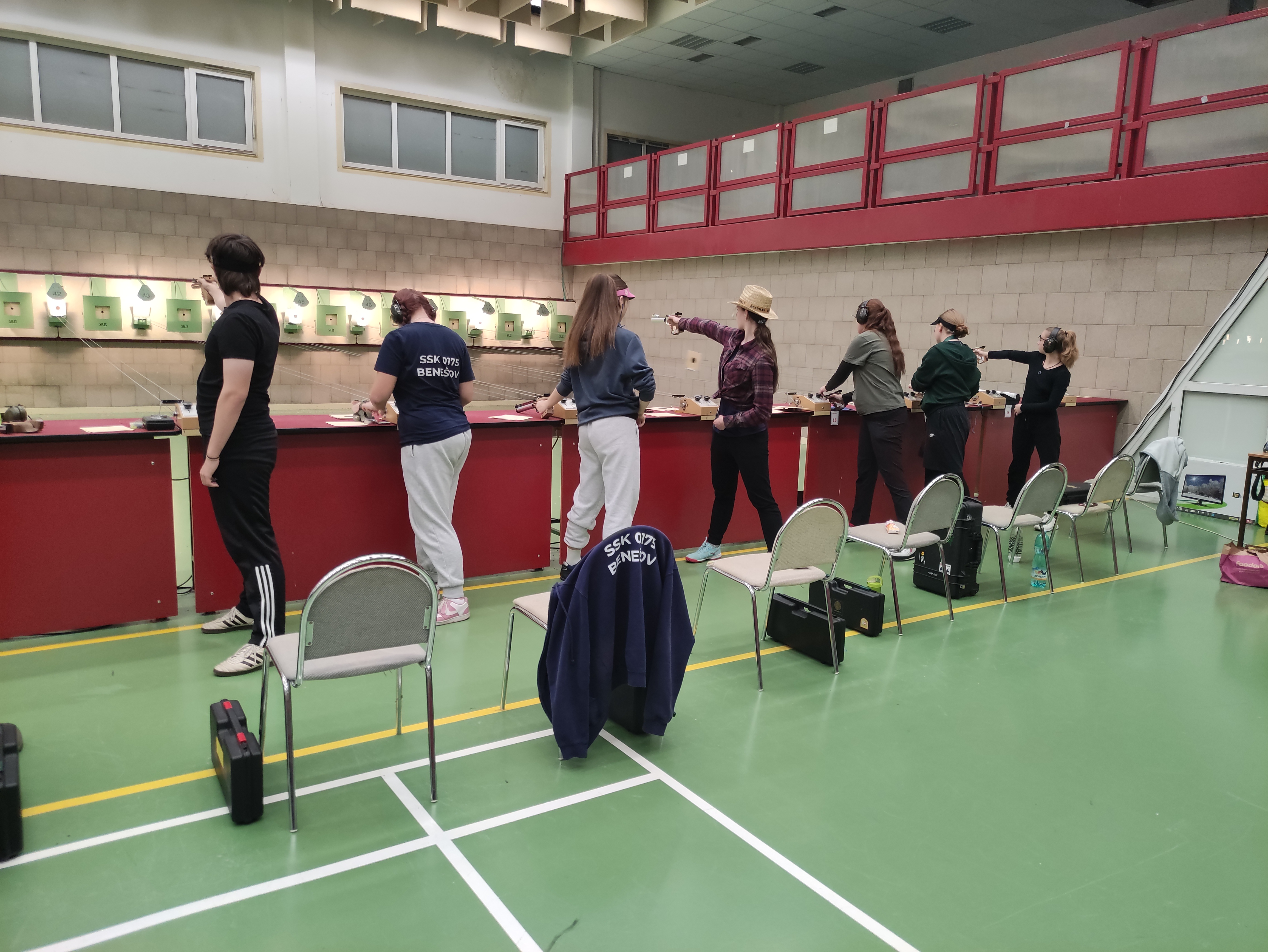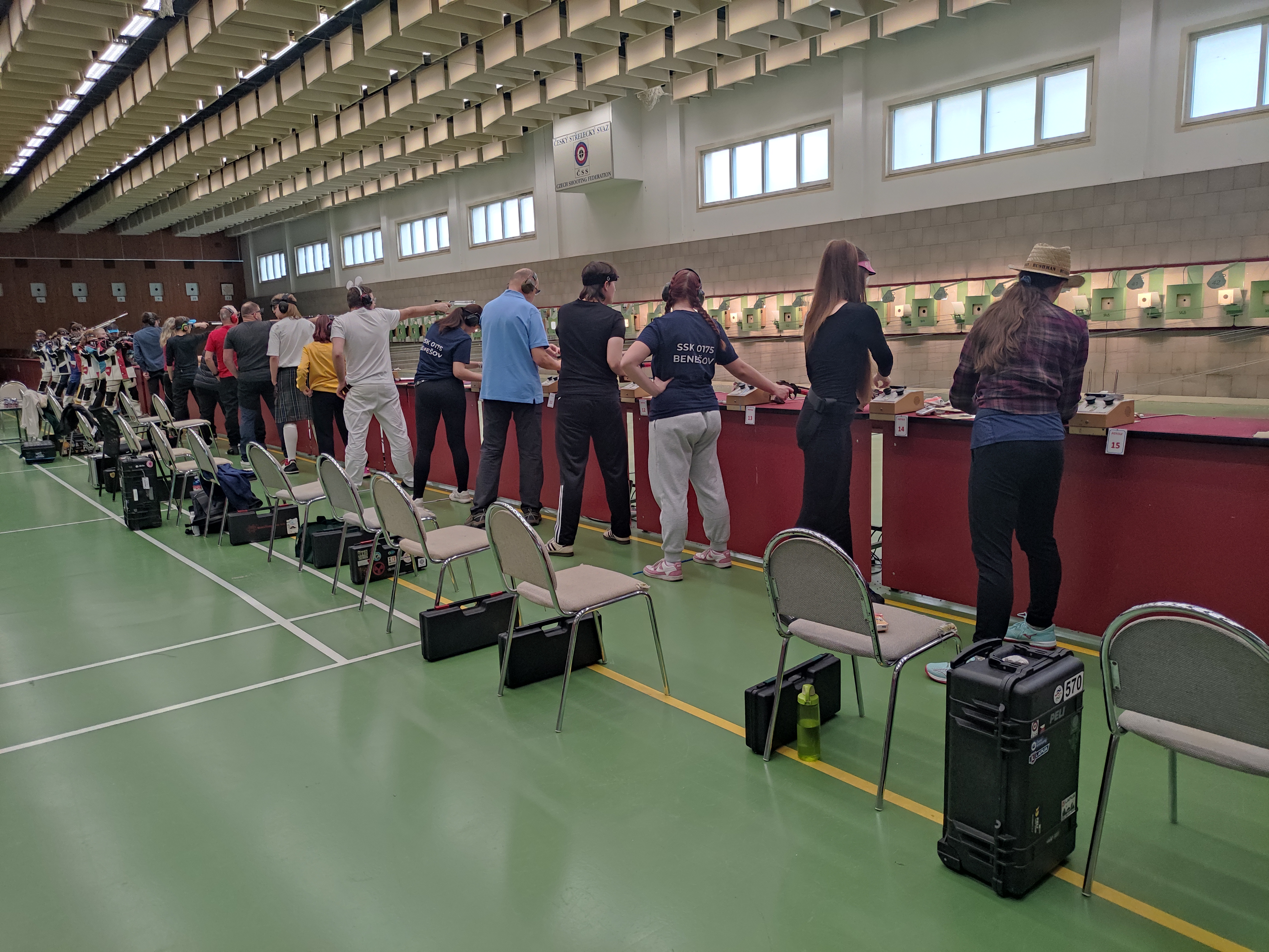 V sobotu dopoledne po registraci a zahájení soutěže začaly první diabolky vytvářet dírky v terčích. Členové družstva, kteří právě nestříleli a čekali na svou směnu, posedávali a diskutovali ve střelecké hale a okolí.
